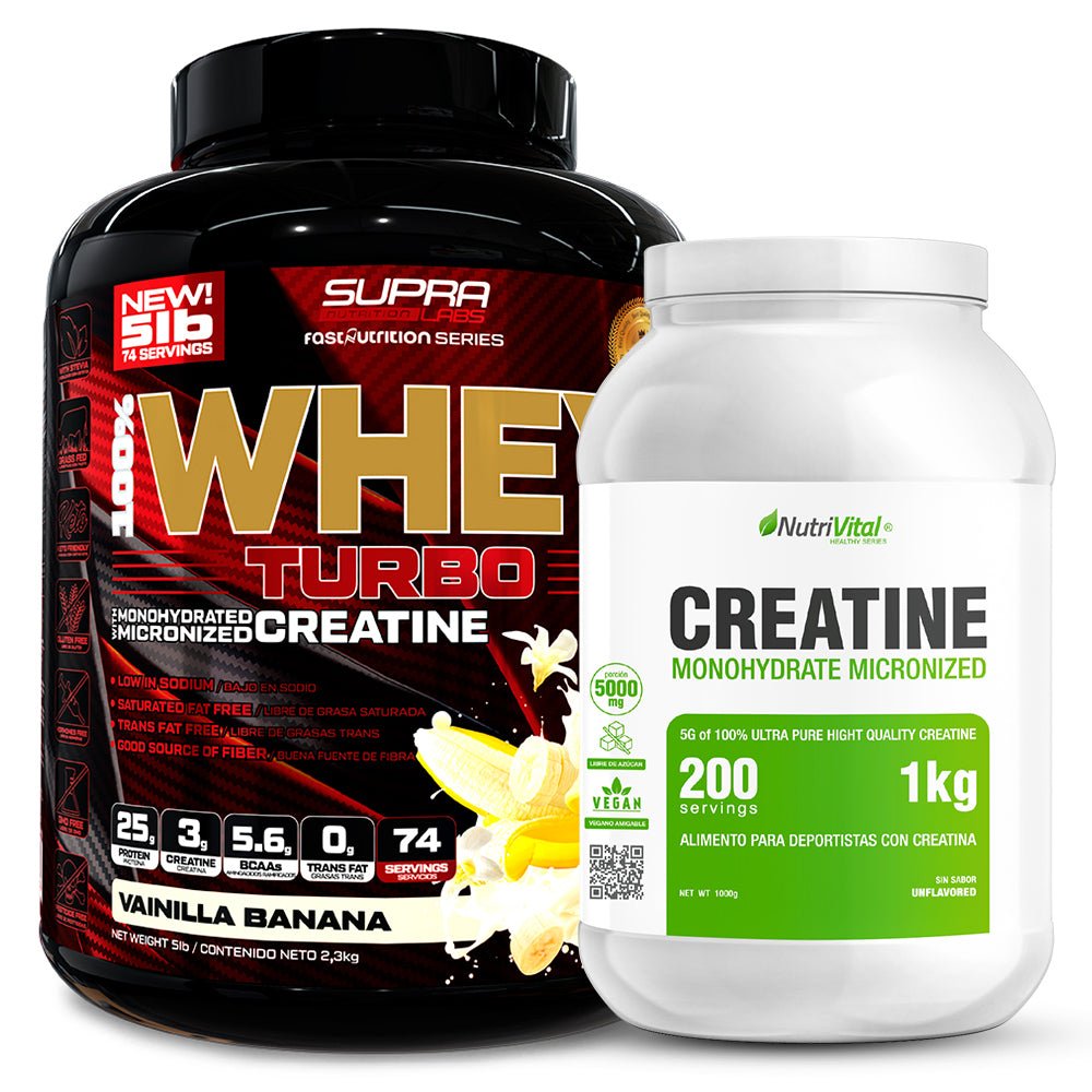 la Whey Turbo 5 lbs de Fast Nutrition, una proteína ultra pura de absorción rápida, y la Creatina Monohidratada Micronizada 1 kg de Nutrivital, con 200 servicios de energía celular pura para tus músculos.